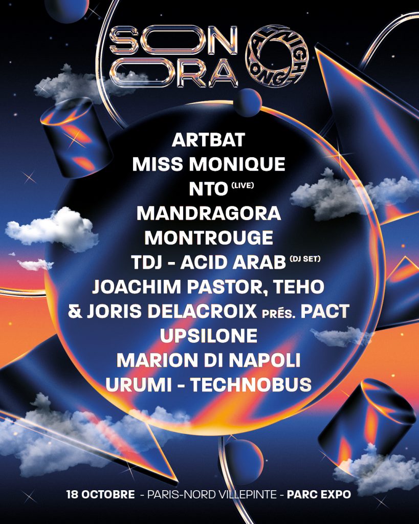 De la techno mélodique de Miss Monique, ARBAT ou NTO au frapcore de Urumi en passant par les sets de TDJ, Acid Arab ou encore Mandragora, All Night Long et Sonora réunissent le meilleur de la scène électronique dans une soirée XXL, ce samedi 18 octobre au Parc Expo de Villepinte.