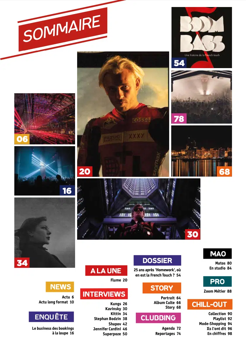 Entre pop et avant garde électronique, le prodige australien nous dit tout de son nouvel album, ‘Palaces’. Egalement au sommaire de ce magazine, des interview de Kungs, Kavinsky, Kittin, Shapov, Superpoze et Jennifer Cardini, une enquête sur les bookings des DJs stars, un dossier sur la place de la French touch 25 ans après le ‘Homework’ des Daft Punk, une rencontre en studio avec Hugo Cantarra, et de nombreuses autres surprises.